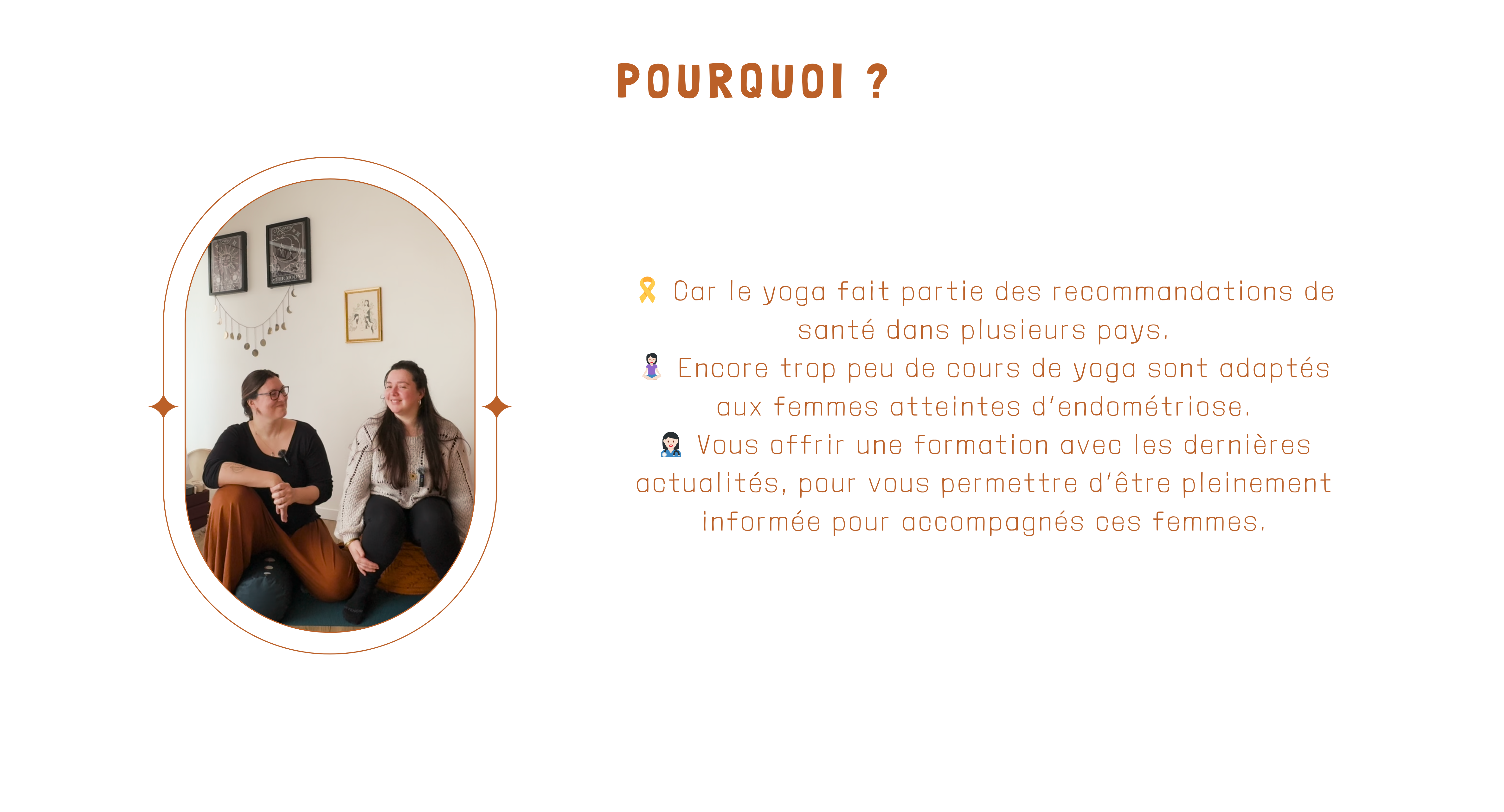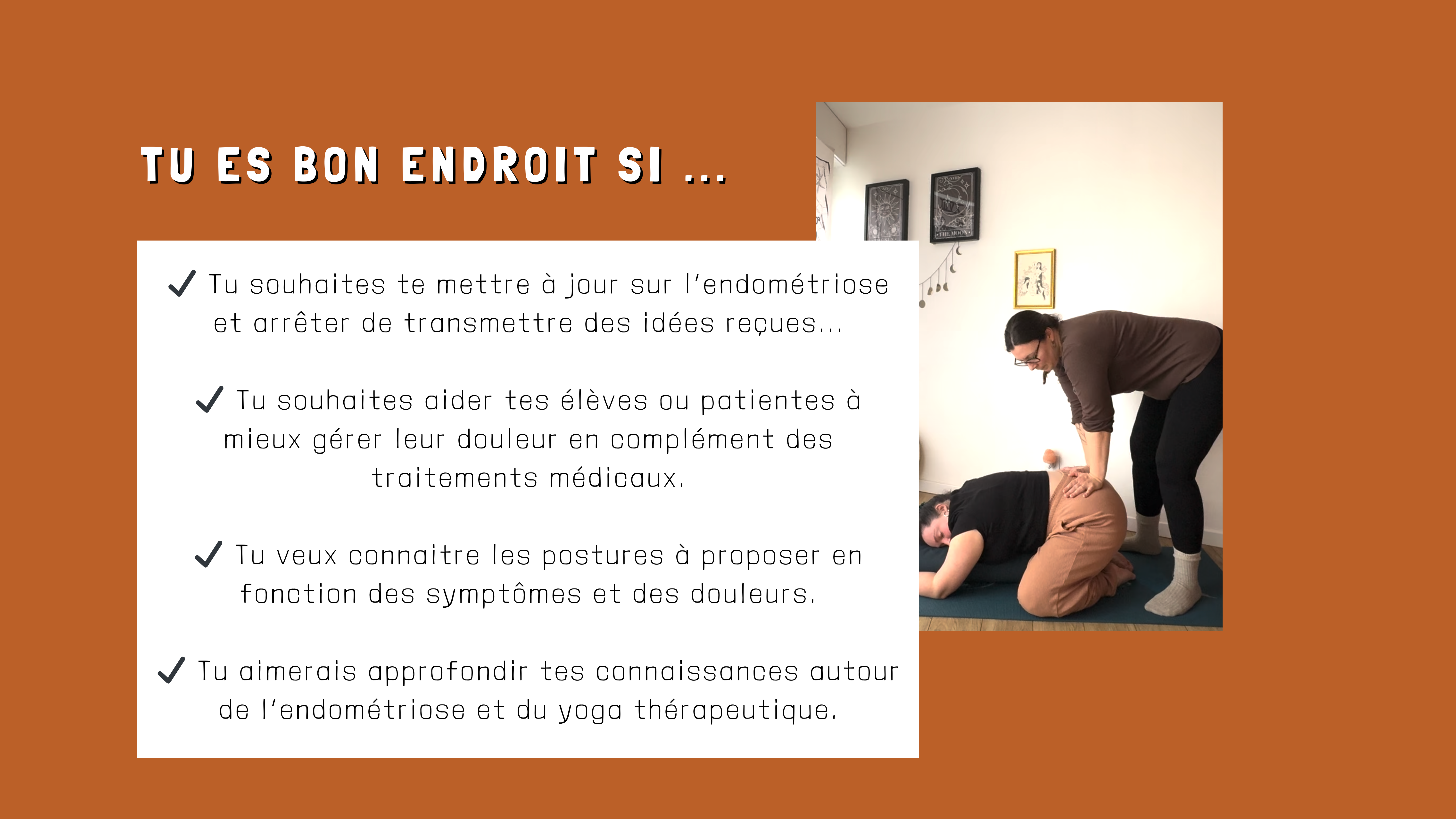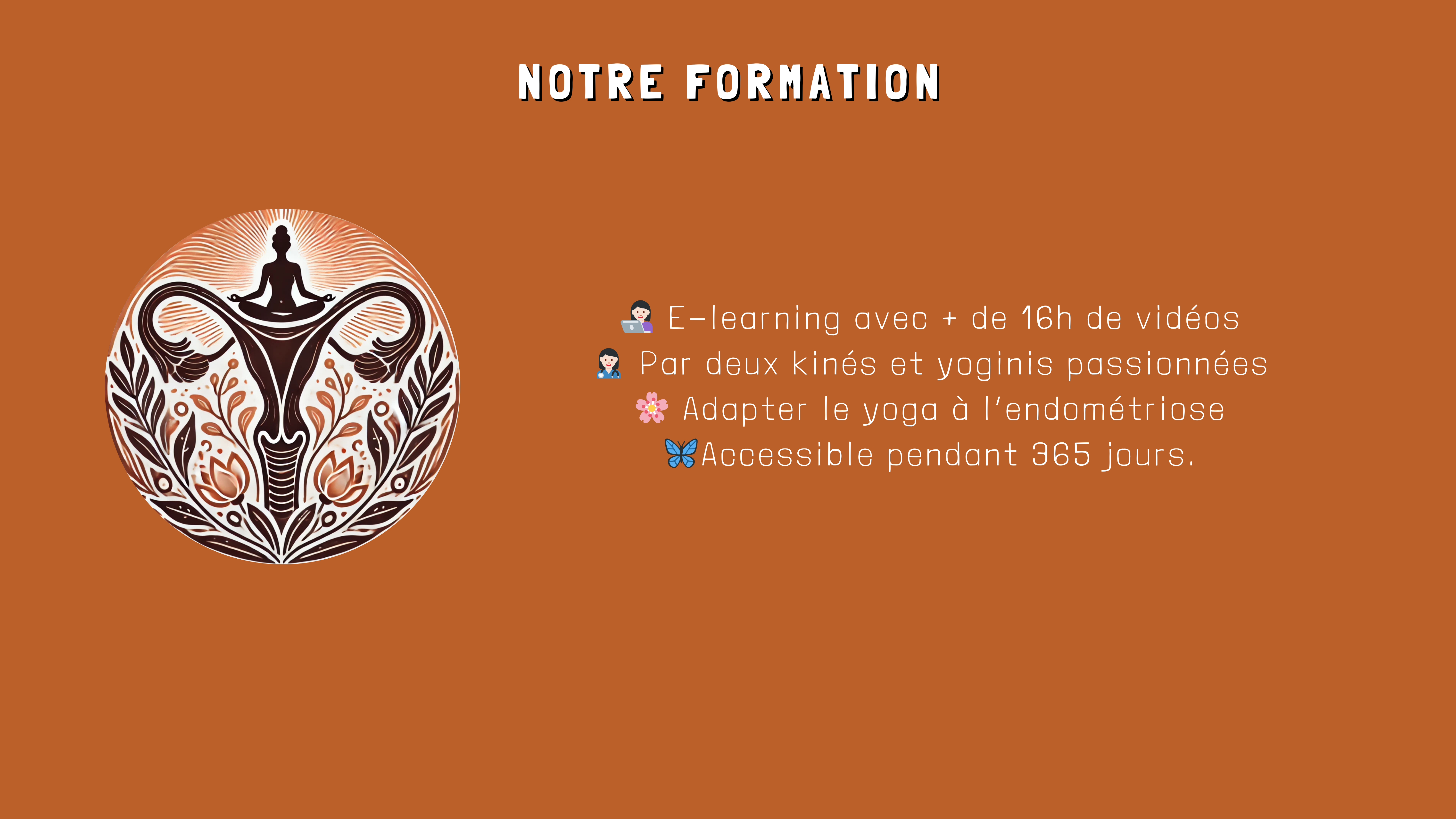 Nous aimons partager nos connaissances et sensibiliser le plus grand nombre à l’endométriose et au yoga. Cependant, cette formation est exclusivement réservée aux professionnels de santé et aux professeurs de yoga. Elle a été conçue pour leur apporter des bases solides afin d’accompagner au mieux les personnes atteintes d’endométriose.