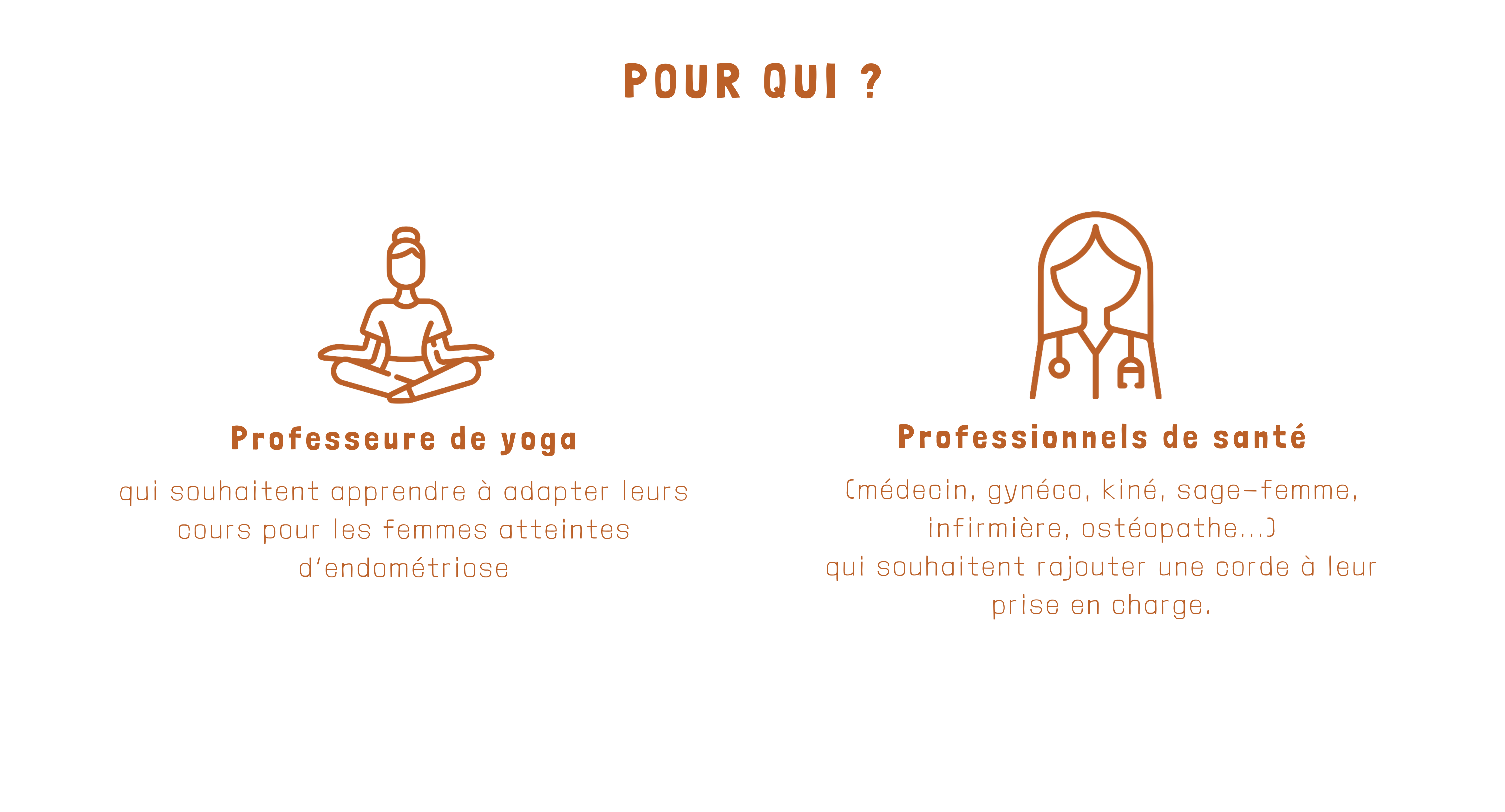 Cette formation s'adresse aux professionnels de santé (médecin, gynécologue, sage-femme, kinésithérapeute, infirmière, ostéopathe...) et aux professeurs de yoga qui souhaitent pouvoir adapter leurs cours ou leurs pratiques aux femmes atteintes d'endométriose.